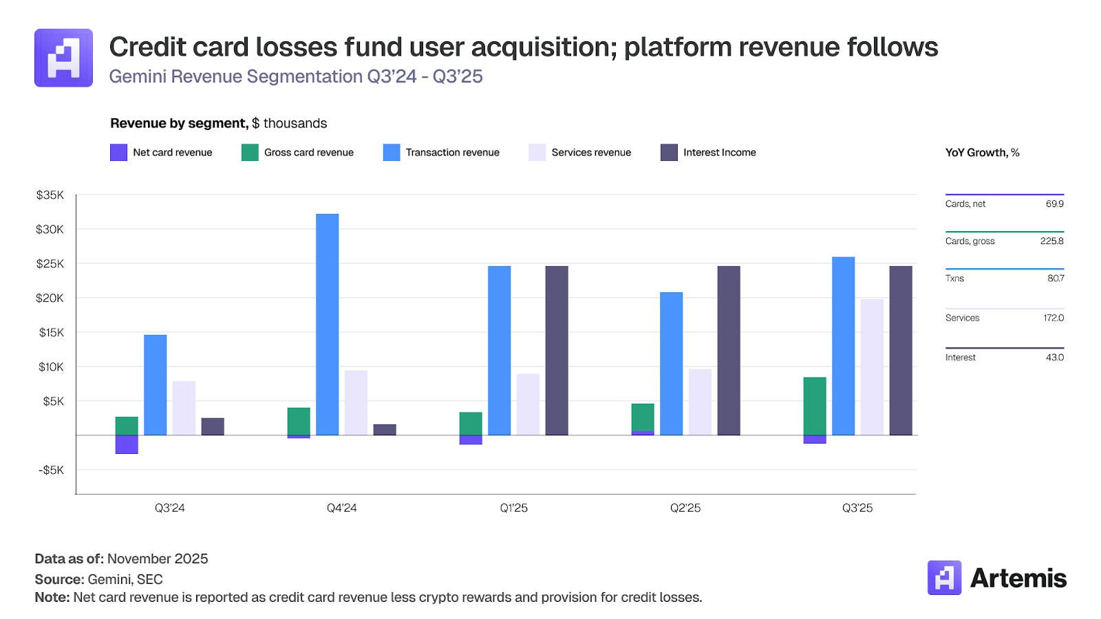 以法币或流动性强的加密货币(如 Gemini、Coinbase、Kraken)支付奖励的 CEX 会产生实际的美元成本,必须依靠交易手续费、利息收入和资产收益来弥补客户获取成本。在 2021 年 1 月收购 Blockrize 之后,Gemini 于 2022 年推出了带有加密货币返现奖励的信用卡计划。尽管 Gemini 信用卡业务持续亏损(见下图紫色部分显示的净信用卡收入),但由于其在用户获取和留存方面表现出色,Gemini 仍继续投资并运营其信用卡产品。