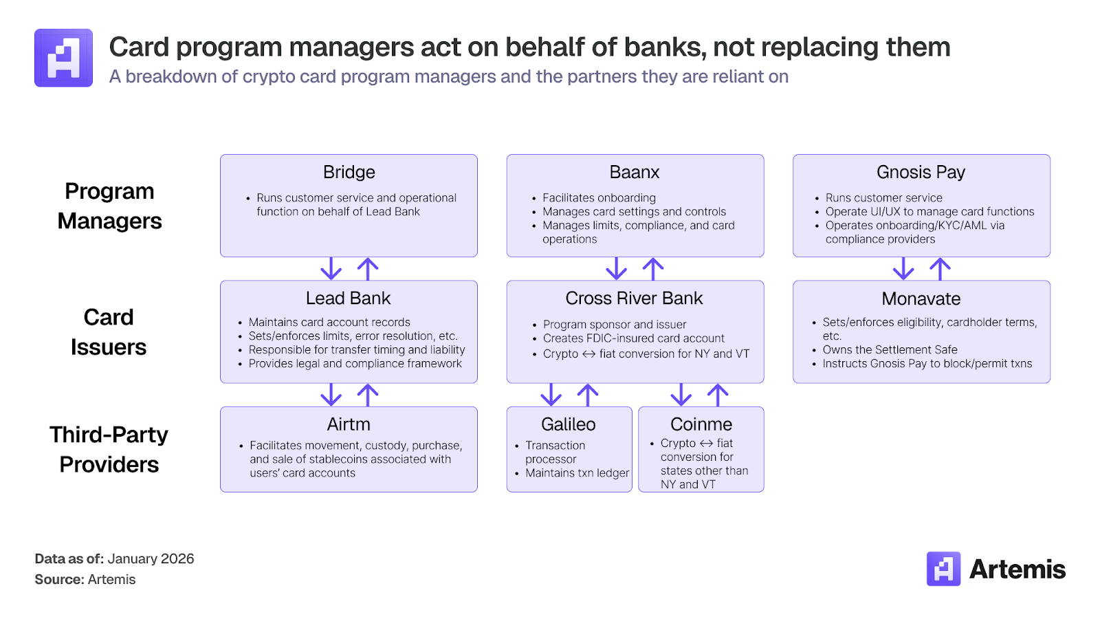 项目管理平台通常与持有 Visa 或万事达卡主要会员资格的发卡银行合作,管理 BIN 赞助关系,处理合规要求,并运营从用户创建的银行账户到所需支付网络的结算系统。各个项目管理平台负责将用户关联数字钱包中持有的加密资产或稳定币转换为法定货币,使其与发卡银行的结算基础设施兼容。项目管理平台提供白标功能,使其他公司能推出自有品牌的卡产品。这些白标卡项目管理公司的例子包括 Baanx、Bridge 和 Gnosis Pay。