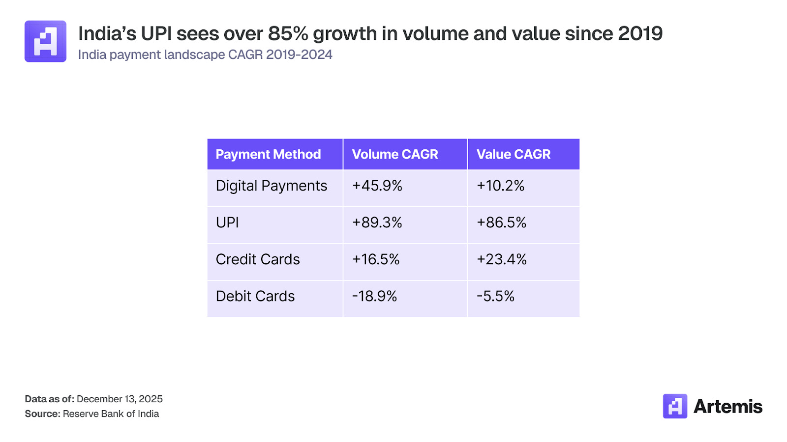 根据印度储备银行发布的《2025 年支付系统报告》,UPI 在 2018 年至 2024 年间,数字交易量的占比从 19% 增长至 83%。该系统提供的特性与加密卡的价值主张高度契合,例如资金即时转账、全天候可用、虚拟支付地址等。因此,许多加密卡发行商已开始与 UPI 集成,以便触达潜在客户。