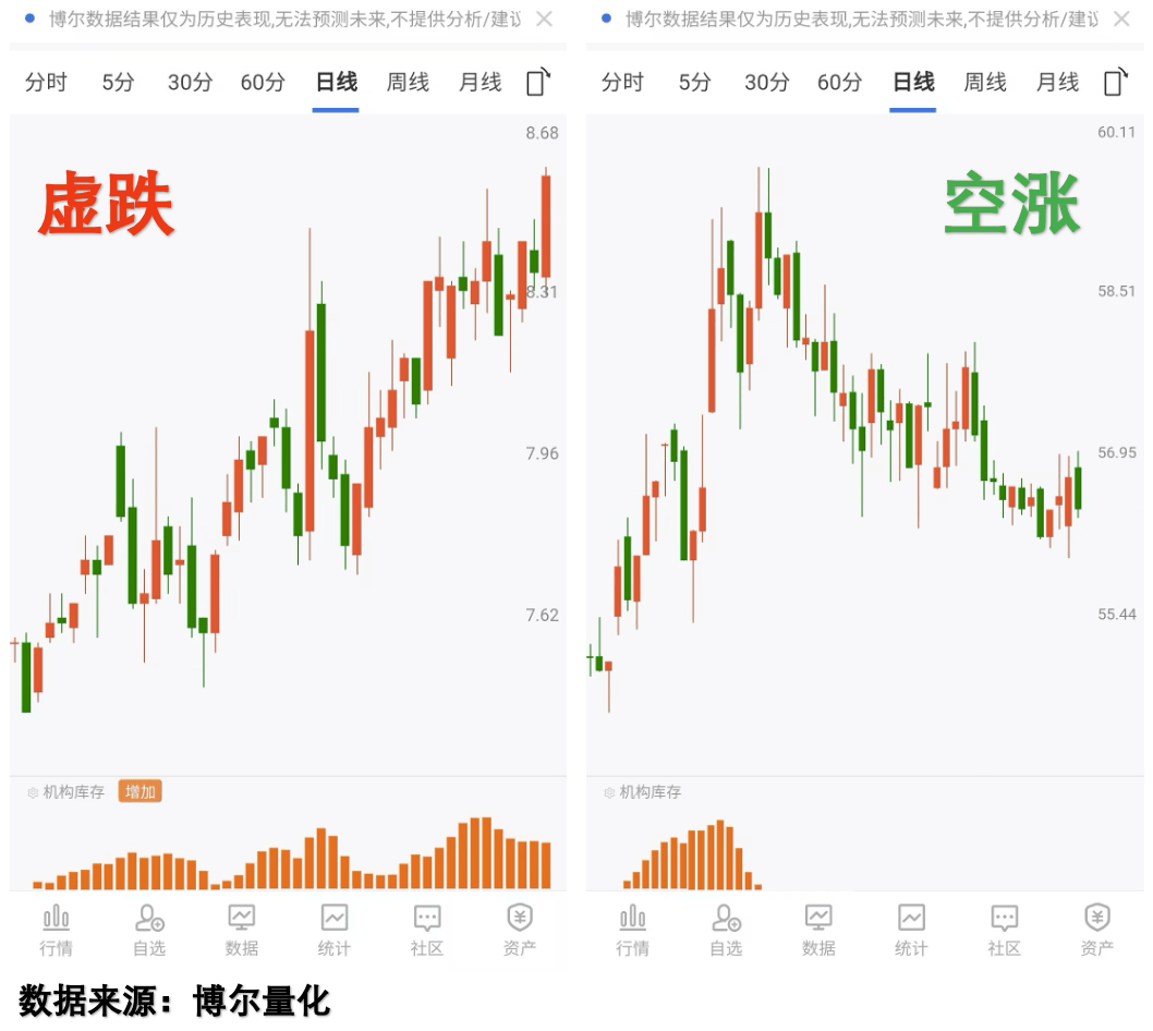 三、两类典型走势的行为差异对比市场中存在两类极具迷惑性的走势:一类是冲高回落式的震荡上行,一类是下跌过程中的反复反弹。仅从K线走势解读,前者易被视为抛盘沉重,后者易被误判为资金抄底,而量化大数据能清晰呈现背后的行为逻辑差异。