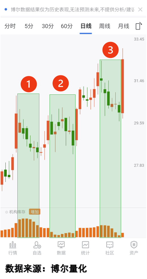 图中个股整体呈上行趋势,但运行过程一波三折,标注的三个区间内调整幅度显著,甚至接近破位迹象。从量化大数据视角观察,三个调整区间内,反映机构资金活跃程度的「机构库存」数据始终存在,未出现中断。这一行为特征明确显示,机构资金在股价调整阶段仍在积极参与交易,并未因走势震荡而停止动作。这种走势与行为的反差,正是市场表象下的核心线索。