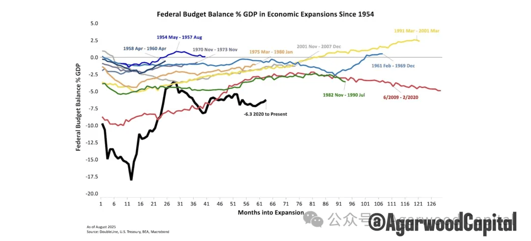 • IMF、各大机构与美国 CBO 的中期预测都指出,美国未来十多年联邦赤字与政府债务占 GDP 比例会维持在偏高水平,如图4所示,2020年以来,虽然联邦预算在经济扩张期占GDP比例从历史最高位有所回落,但对比其他扩张期,仍处于1954年以来最高水位。