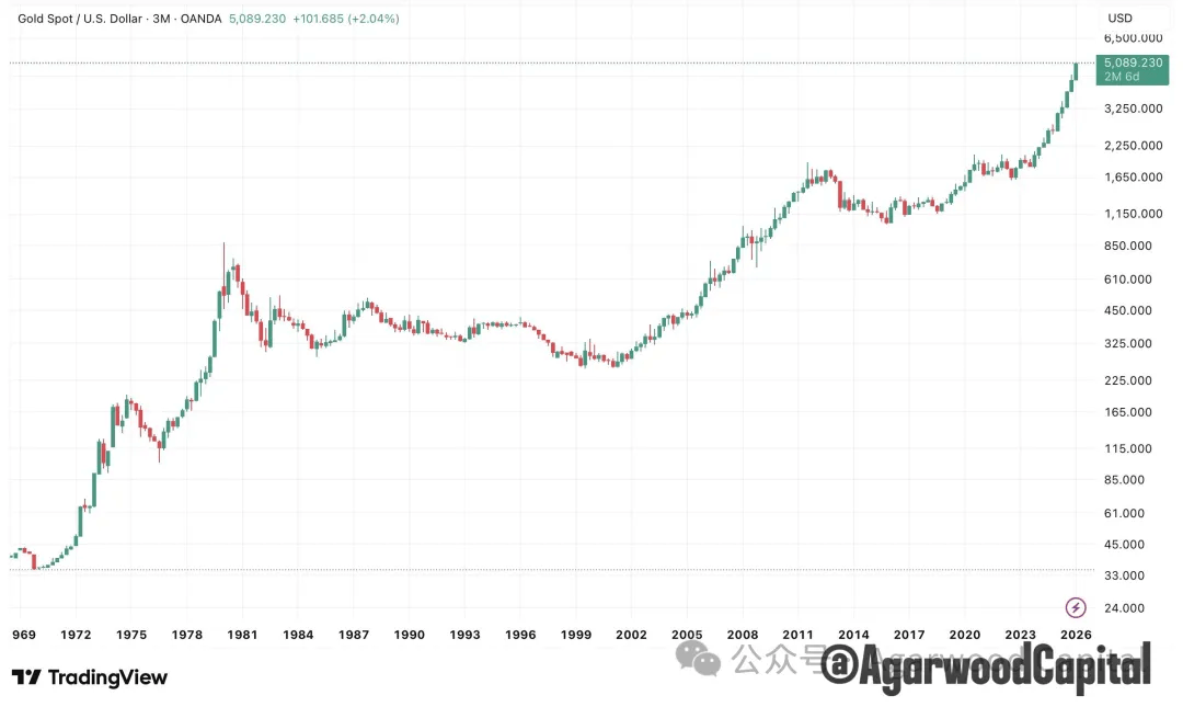 图 1:黄金价格季度图(对数刻度)