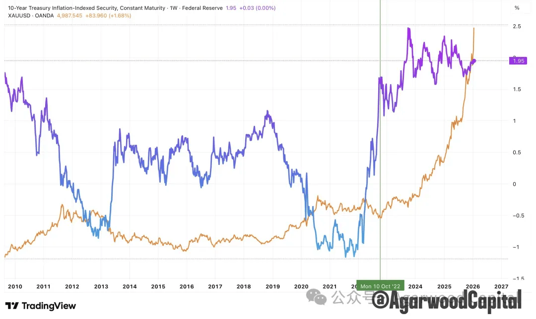 实证来看,黄金与美国十年期实质利率长期仍呈负相关,不过 2022 年以来的经验显示:在央行成为主力买家的阶段,即便实质利率处于偏高水平,黄金依旧能创历史新高。利率与利率预期现在更接近「决定私人部门是否愿意在央行托底之上追加杠杆」,不再单独决定黄金的长期方向。