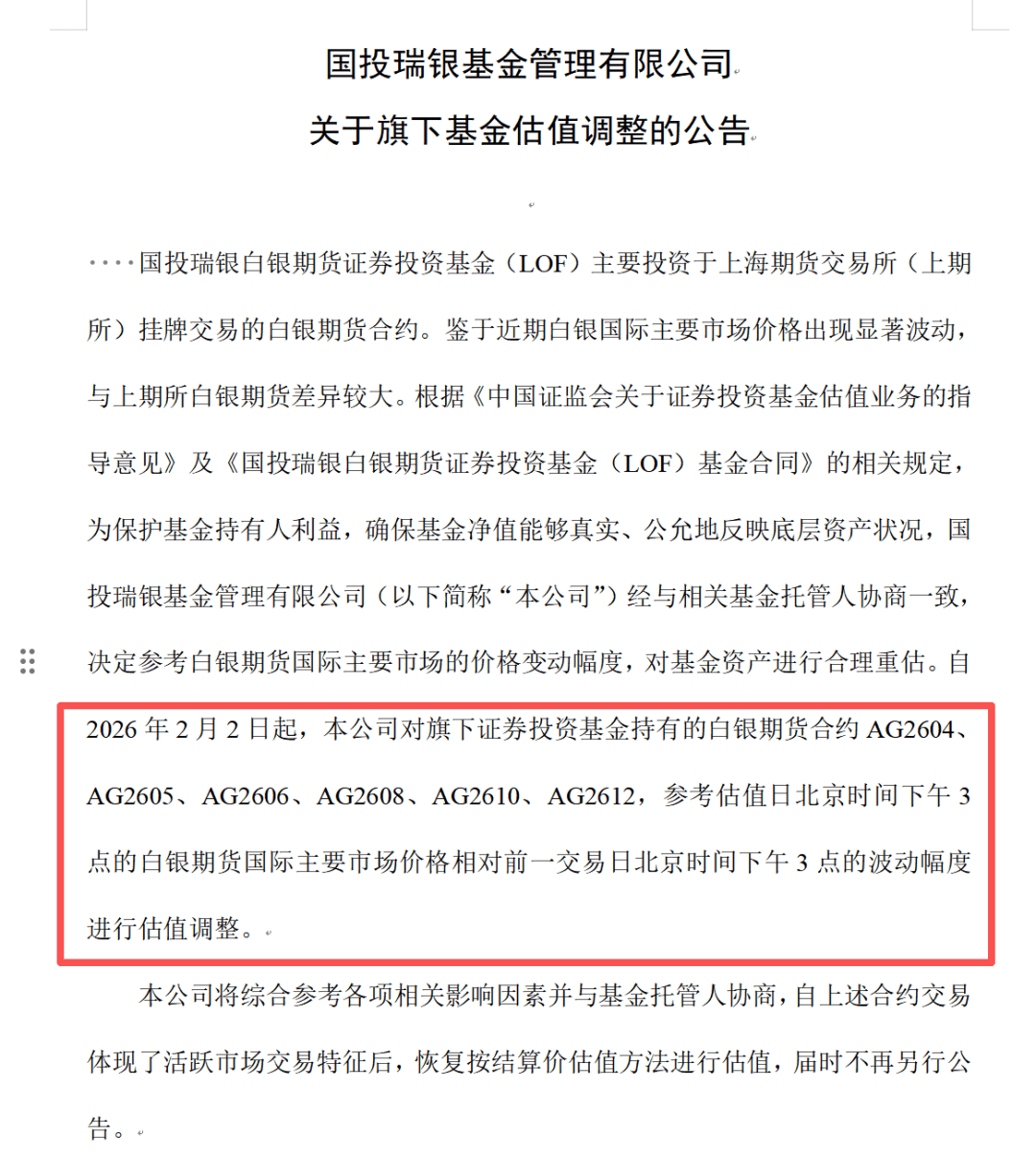 自2026年2月2日起,本公司对旗下证券投资基金持有的白银期货合约AG2604、AG2605、AG2606、AG2608、AG2610、AG2612,参考估值日北京时间下午3点的白银期货国际主要市场价格相对前一交易日北京时间下午3点的波动幅度进行估值调整。