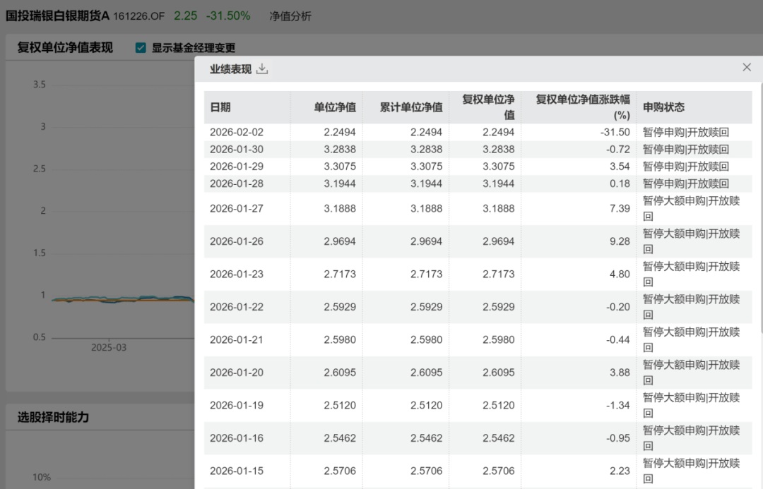 举个例子:假设国际银价下跌30%,但受制于17%的跌停限制,上期所白银期货仅下跌17%,若基金继续按其下跌17%的价格估值,其净值将“高估”实际资产价值,形成所谓的“估值滞后”。这种偏差意味着,基金账面的净值已不能准确代表其所持资产的真实价值。
