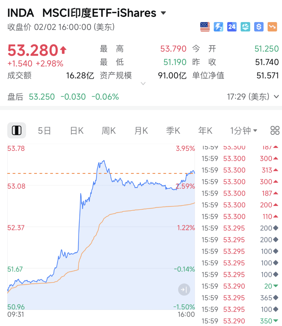 受此影响,在美上市的印度ETF(iShares MSCI India ETF)在盘中直线拉升,一度大涨近4%;印度卢比兑美元汇率亦大幅拉升,日内一度大涨超1%。