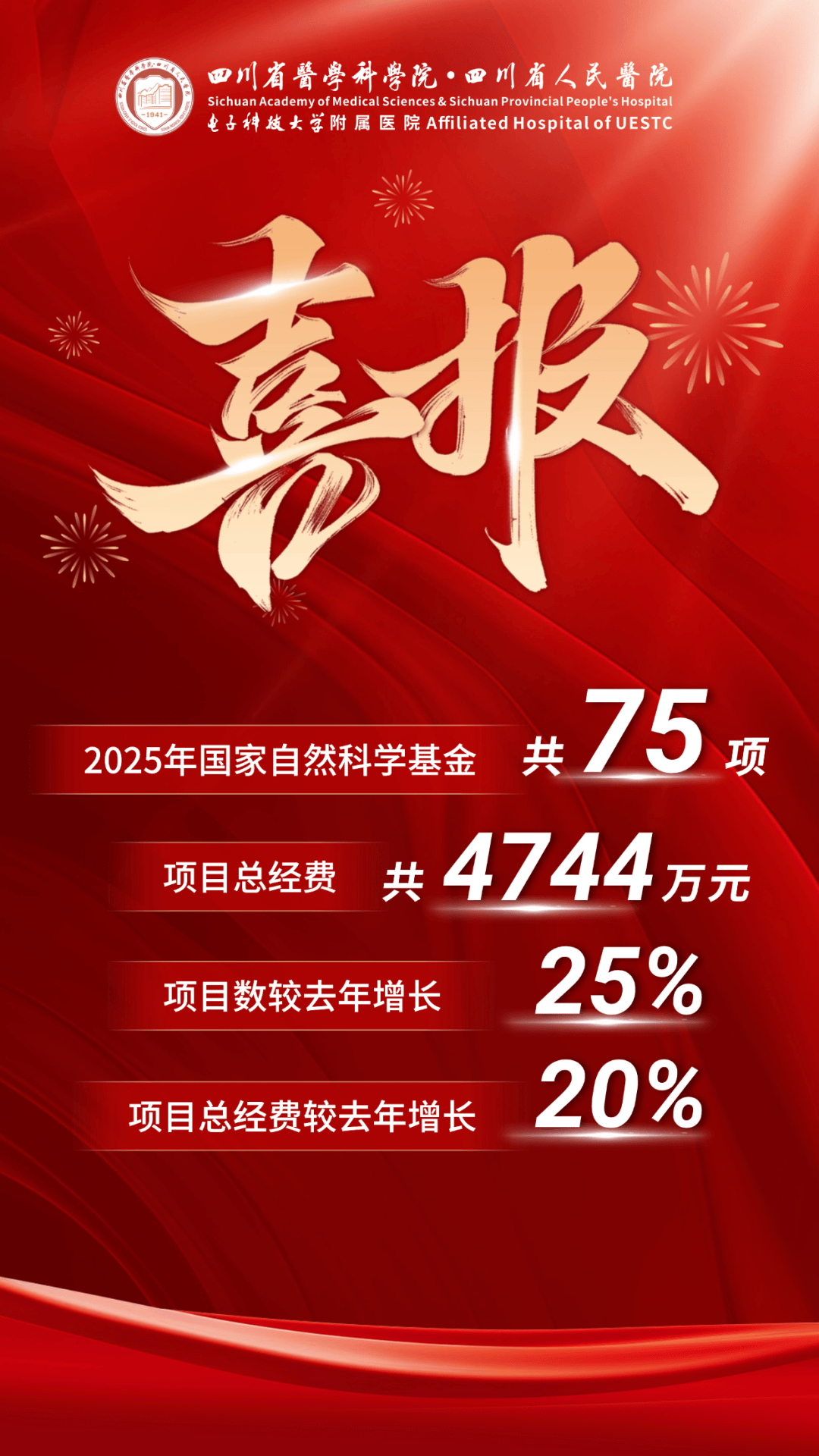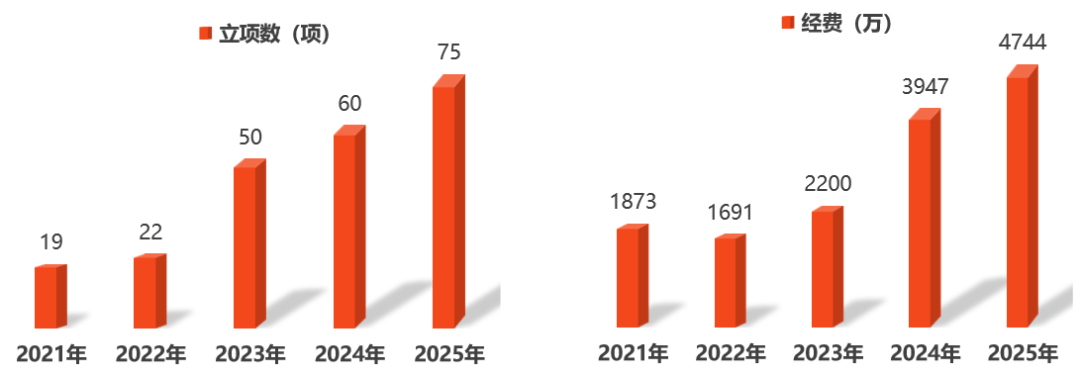 至此,2025年我院共获批国家自然科学基金项目75项,其中区域联合基金集成项目1项、区域联合基金集成课题1项、区域联合基金重点项目1项 ,专项项目5项,原创探索1项,面上项目29项,青年科学基金项目(C类)37项,实现获批项目总经费4744万元,立项总数和立项经费均创历史新高。