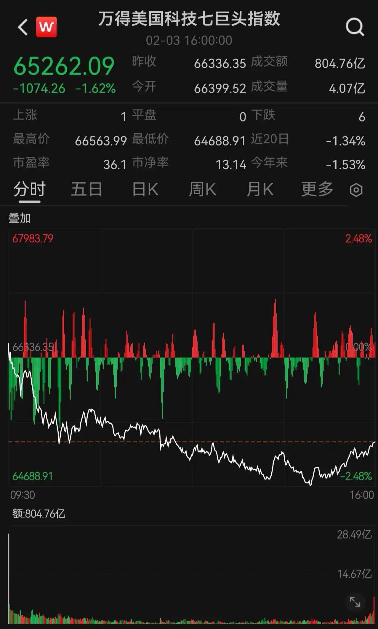 当地时间2月3日,美股三大股指全线收跌,道指跌0.34%,标普500指数跌0.84%,纳指跌1.43%。万得美国科技七巨头指数跌1.62%,微软、英伟达跌近3%。