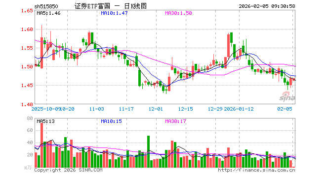 2月5日,证券ETF富国(515850)开盘跌0.48%,报1.462元。证券ETF富国(515850)重仓股方面,东方财富开盘跌0.61%,中信证券跌0.32%,国泰海通跌0.05%,华泰证券跌0.14%,广发证券涨0.00%,招商证券跌0.12%,东方证券跌0.10%,兴业证券跌0.58%,申万宏源涨0.00%,中金公司跌0.14%。