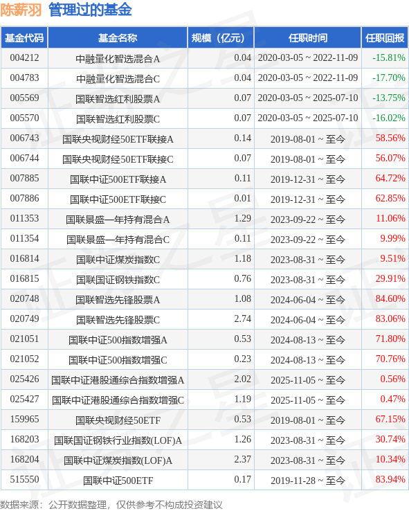 陈薪羽先生:中国国籍,毕业于北京大学概率论与数理统计专业,硕士研究生学历,具有基金从业资格。2015年8月至2016年10月任中国人保寿险首席投资官秘书。2016年10月加入国联基金管理有限公司,现任指数投资部基金经理。拟任国联中证港股通综合指数增强型证券投资基金的基金经理。2024年08月起至今任国联中证500指数增强型证券投资基金的基金经理、现任国联央视财经50交易型开放式指数证券投资基金(2019年08月起至今)、国联央视财经50交易型开放式指数证券投资基金联接基金(2019年08月起至今)、2019年11月28日至今担任国联中证500交易型开放式指数证券投资基金基金经理。2020年3月5日至2020年07月担任中融量化小盘股票型发起式证券投资基金基金经理。2020年3月5日起担任国联智选红利股票型证券投资基金基金经理。2020年3月5日至2022年12月担任中融量化智选混合型证券投资基金基金经理。2023年8月31日起担任国联中证煤炭指数型证券投资基金基金经理。2023年8月31日起担任国联国证钢铁行业指数型证券投资基金基金经理。2023年9月22日起担任国联景盛一年持有期混合型证券投资基金基金经理。国联智选先锋股票型证券投资基金(2024年06月起至今)的基金经理。