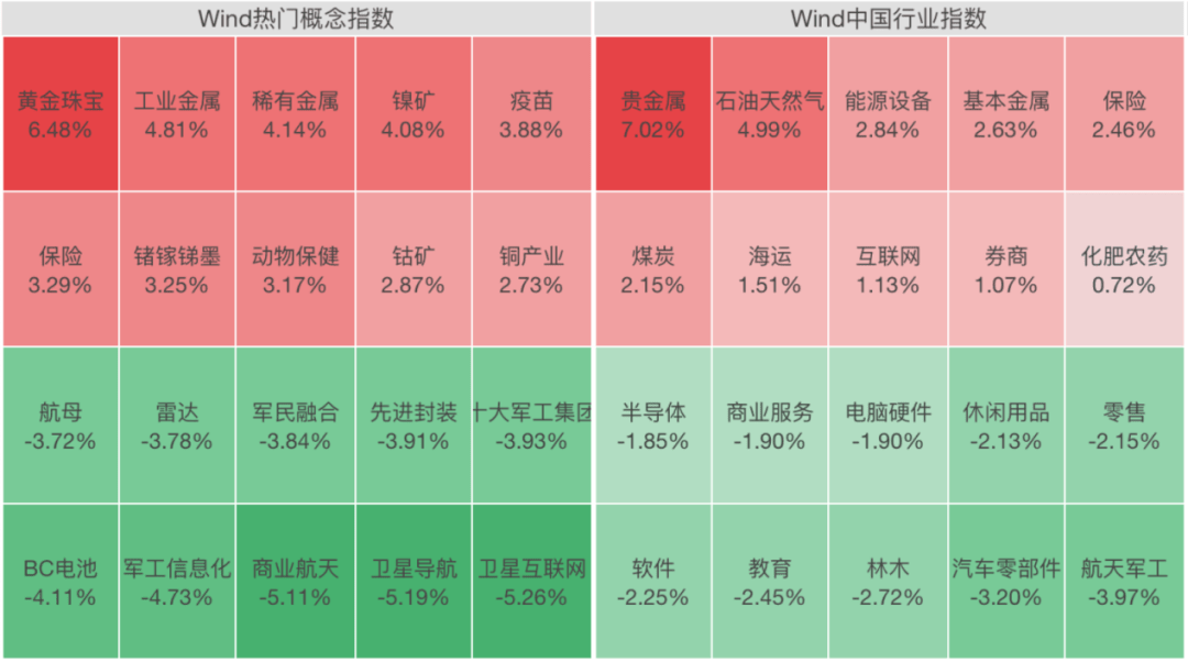 盘面上,贵金属、石油天然气、大金融等板块涨幅居前;航天航空、计算机设备、电子化学品等板块跌幅居前。