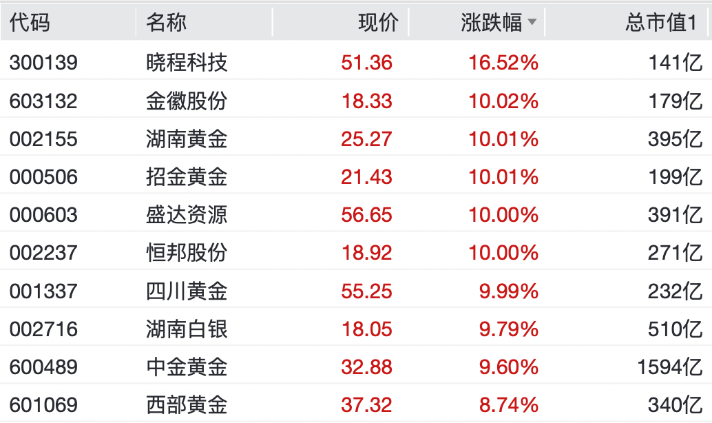 个股方面,湖南黄金一字涨停,金徽股份、招金黄金、盛达资源、恒邦股份、四川黄金均实现10cm涨停,晓程科技涨超16%,湖南白银、中金黄金、西部黄金、华锡有色等纷纷上涨。