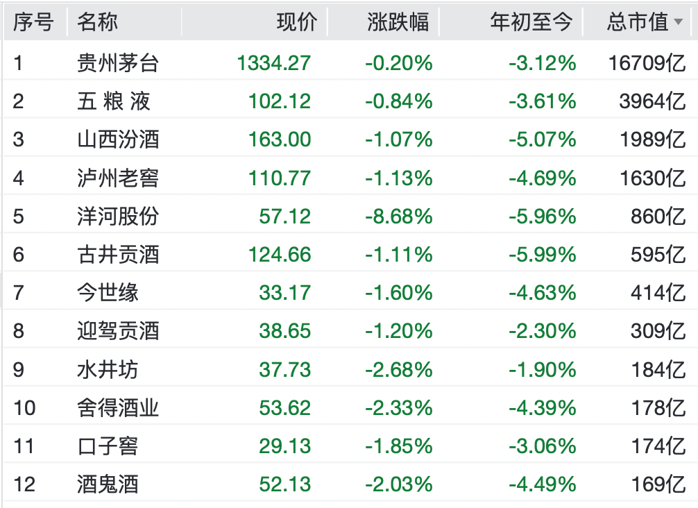 个股方面,洋河股份跌超8%,贵州茅台、五粮液、山西汾酒、泸州老窖、古井贡酒等纷纷下跌。