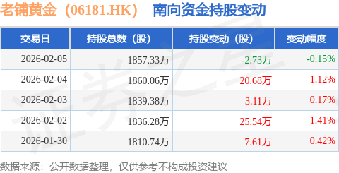 证券之星消息,2月5日南向资金减持2.73万股老铺黄金(06181.HK)。近5个交易日中,获南向资金增持的有4天,累计净增持54.21万股。近20个交易日中,获南向资金减持的有11天,累计净减持128.36万股。截至目前,南向资金持有老铺黄金(06181.HK)1857.33万股,占公司已发行普通股的12.93%。