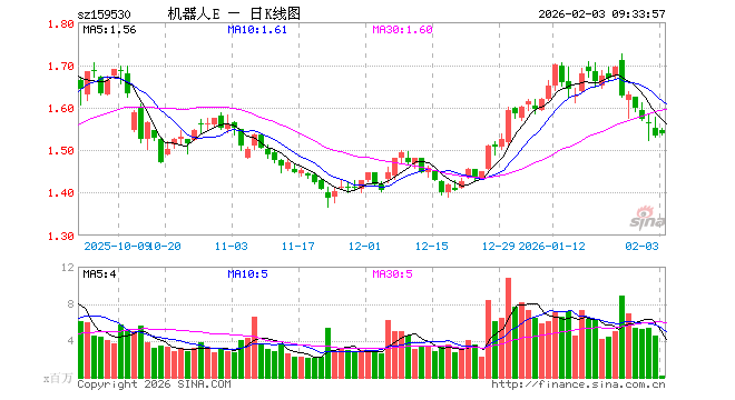 2月3日,机器人ETF易方达(159530)开盘涨0.91%,报1.547元。机器人ETF易方达(159530)重仓股方面,绿的谐波开盘涨0.57%,双环传动涨0.94%,机器人涨1.30%,石头科技涨0.64%,科沃斯涨0.85%,三花智控涨0.39%,拓普集团涨1.24%,鸣志电器涨0.94%,领益智造涨1.11%,科大讯飞涨1.74%。