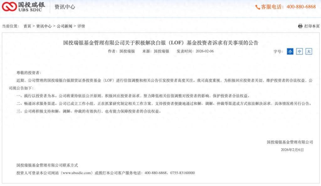 2月6日,国投瑞银基金发布一则关于积极解决白银(LOF)基金投资者诉求有关事项的公告。