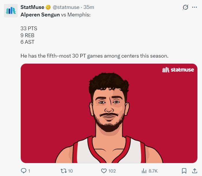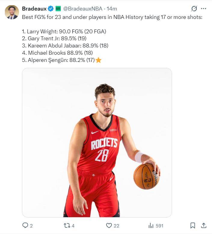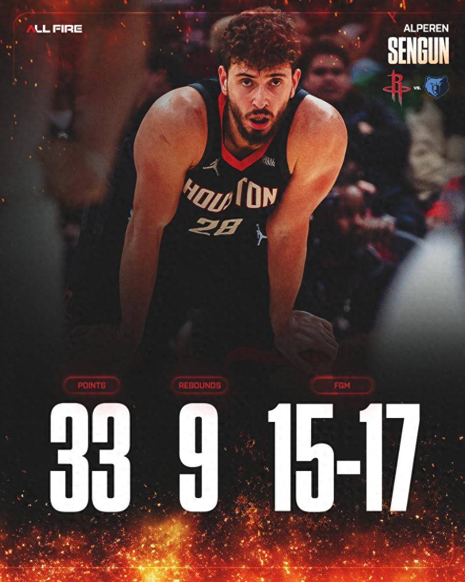 申京的惊艳表现,瞬间引爆了休斯顿媒体,关于他的讨论铺天盖地。他的高效不仅体现在得分上,更体现在他所创造的一系列纪录上。他成为了自贾巴尔之后,最年轻的以至少17次出手仅投失2球的中锋。此外,在NBA历史上23岁以下球员出手17次以上,命中率排名中,申京位列第五,仅次于拉里怀特、特伦特、贾巴尔和迈克尔布鲁克斯这些传奇人物。本赛季,申京已经30次得分超过30分,这一数据在中锋球员中排名联盟第五。更值得一提的是,申京是自奥拉朱旺之后,火箭队首位能够单场砍下30 的高命中率中锋。