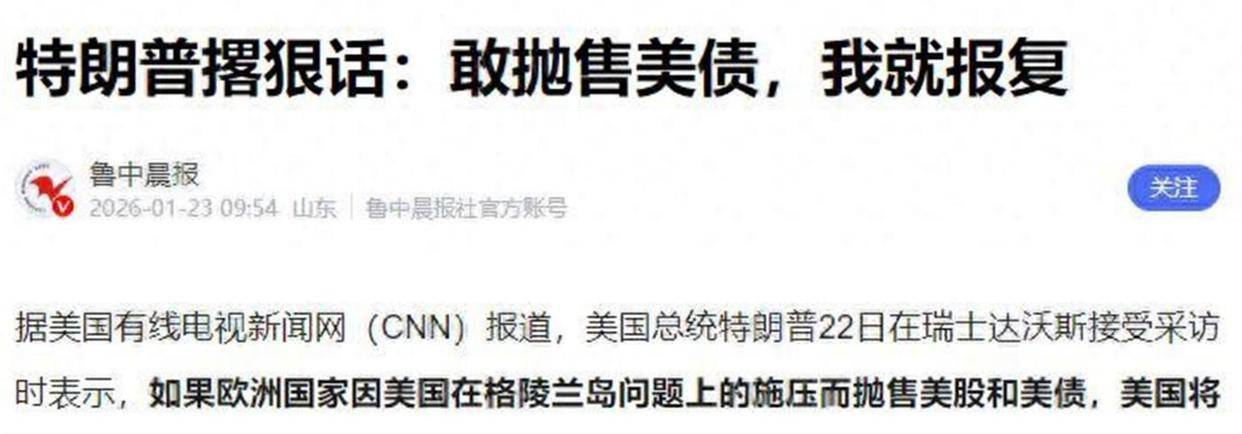 “如果他们真这么做,那就做吧。 但如果真发生这种事,我们将实施重大报复,我们手中握着所有的牌。 ”面对欧洲可能抛售美国资产的猜测,特朗普在2026年1月22日的达沃斯论坛上作出了强硬回应。