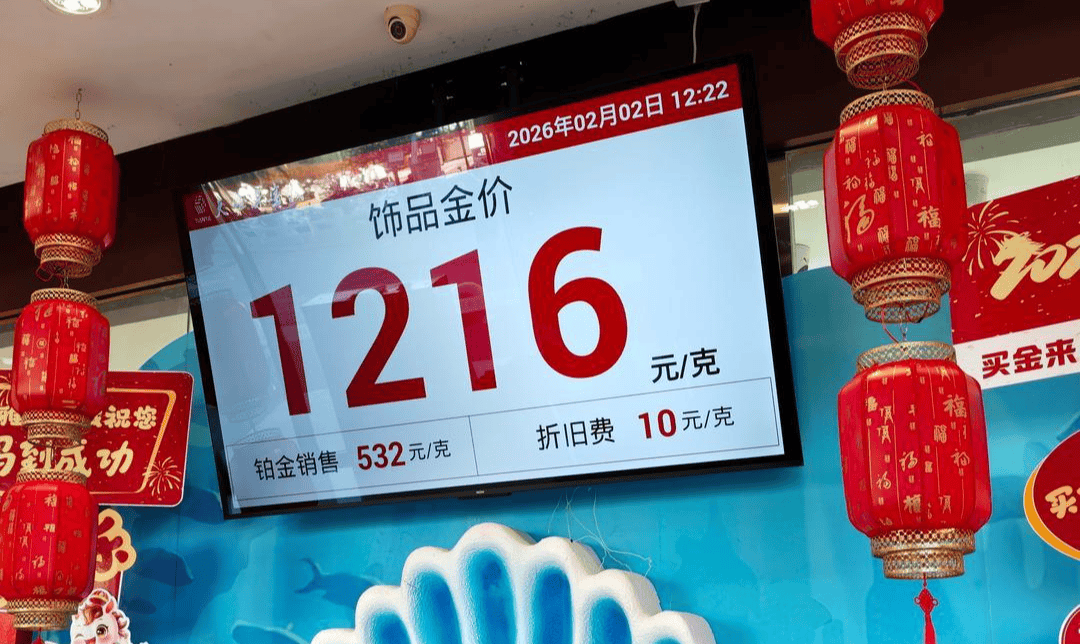 2月2日12时22分,红星新闻记者抵达这里时,大屏幕显示的饰品金价为1216元/克;而在14时26分将要离开时,大屏幕上的数字已经变为1165元/克。