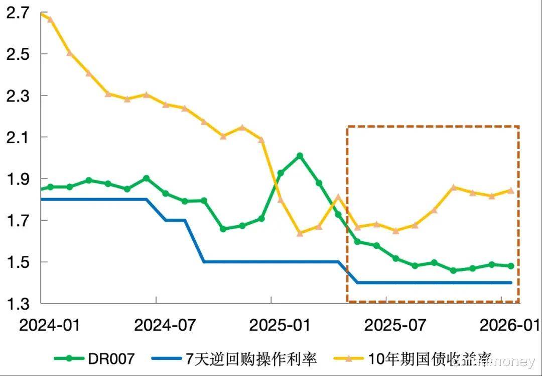 我国10年期国债收益率和货币市场DR007利率的走势在方向上多数时间都保持一致,但自2025年5月以来,国债收益率和DR007的变化呈反向关系,两者的喇叭口扩大,2025年10月达到40BP,较5月放大33BP。