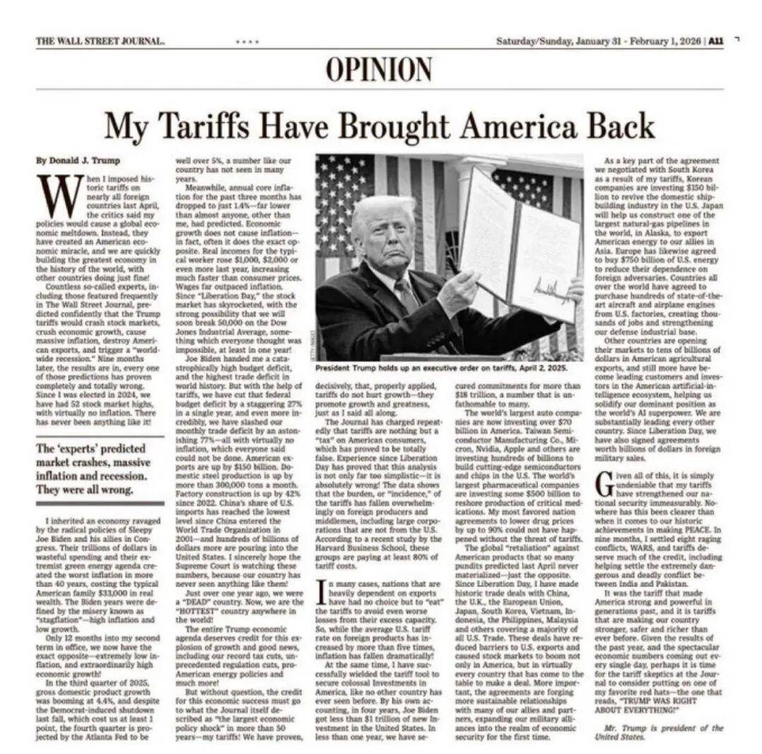1月30日,特朗普在《华尔街日报》发表文章,洋洋洒洒上千字,名为《我的关税政策让美国重回正轨》,自称“我们正在迅速打造世界历史上最伟大的经济体”。可惜的是,白纸黑字,漏洞百出,被美国媒体和网民狠狠打了脸。