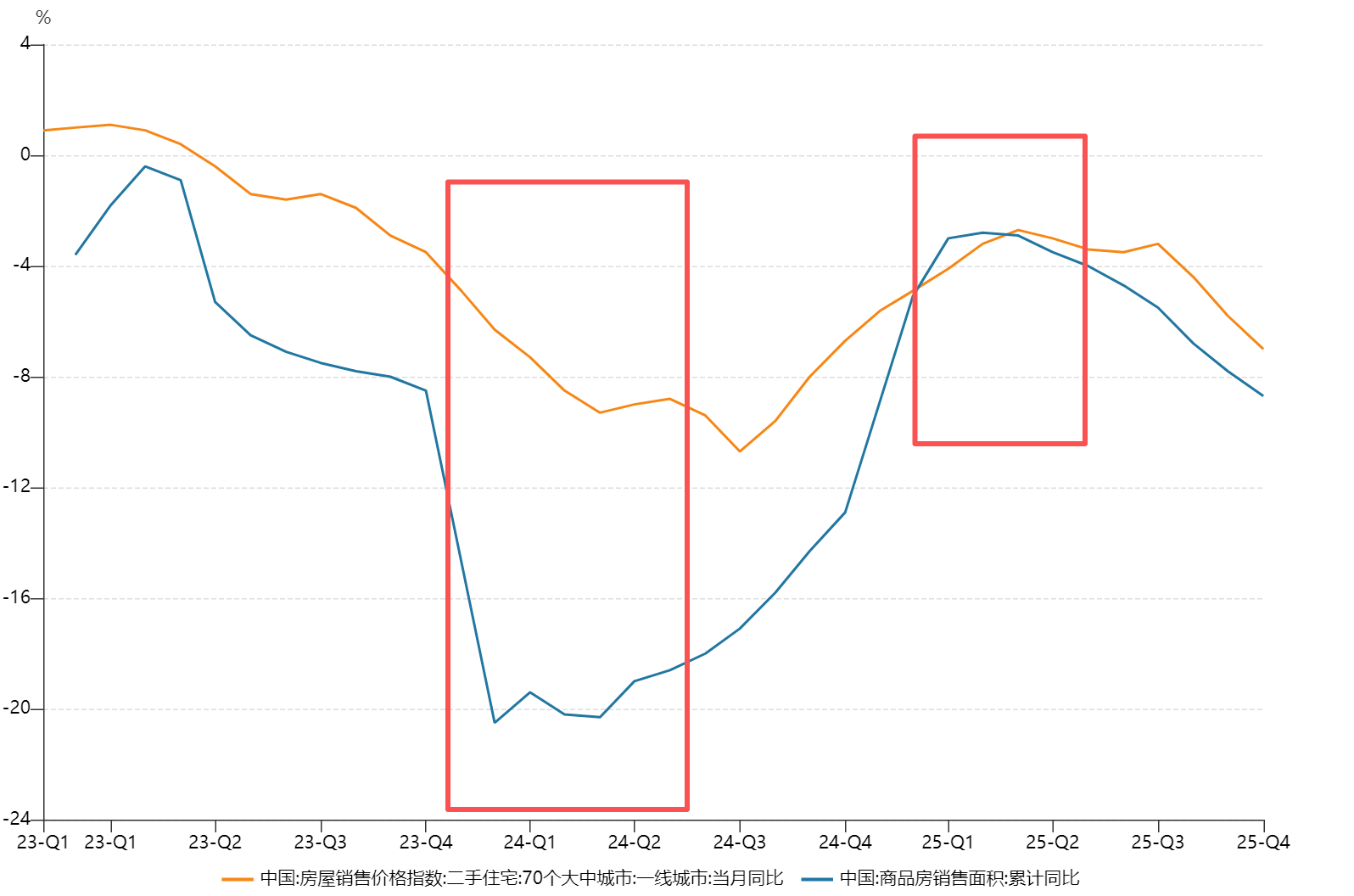 图片趋势描述:从数据趋势分析,从2025年开始商品房的销售面积与销售价格普遍回暖,尤其是2025年上半年,整体降幅收窄明显