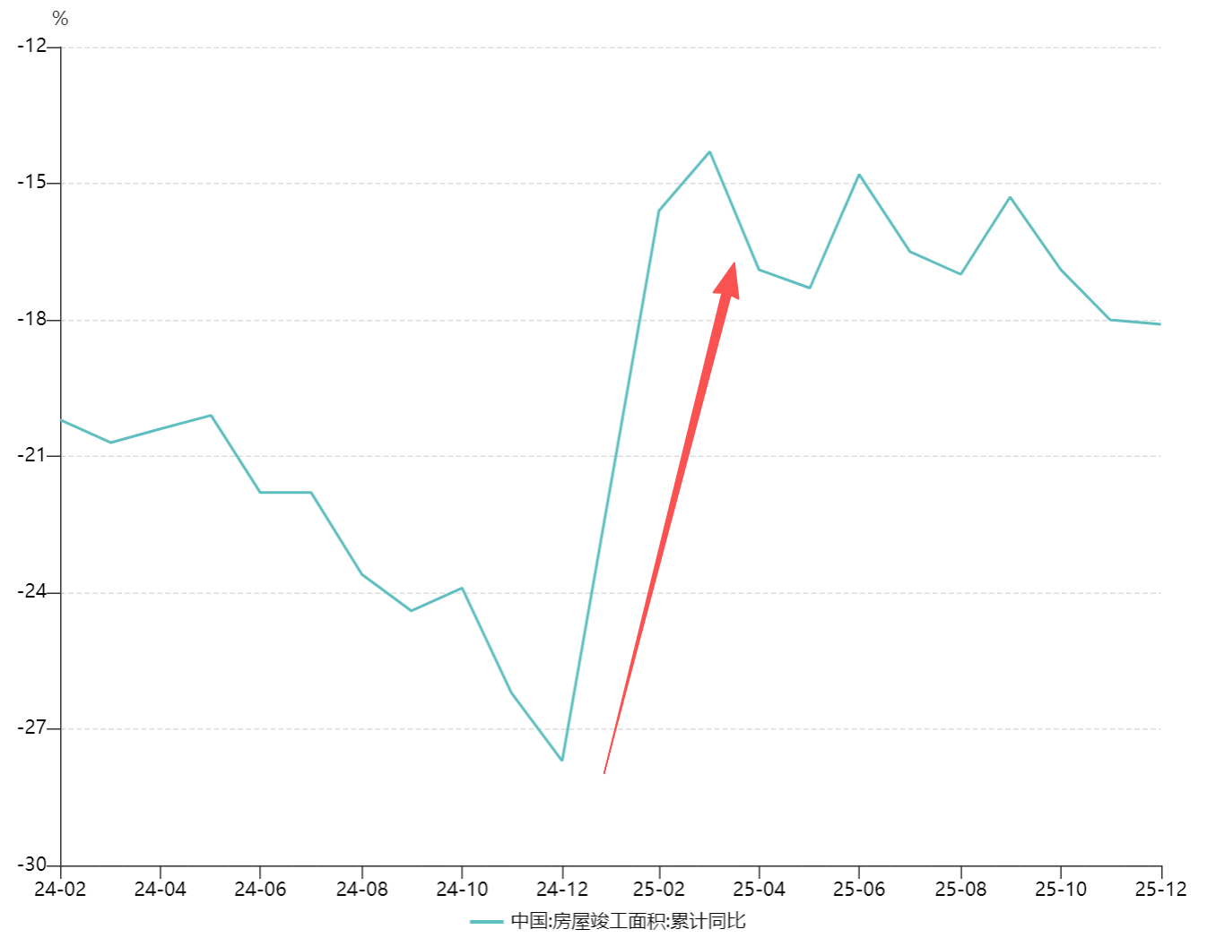 图片趋势描述:从数据趋势分析,从2025年开始房屋竣工面积同比降幅明显收窄,或将拉动建材需求释放