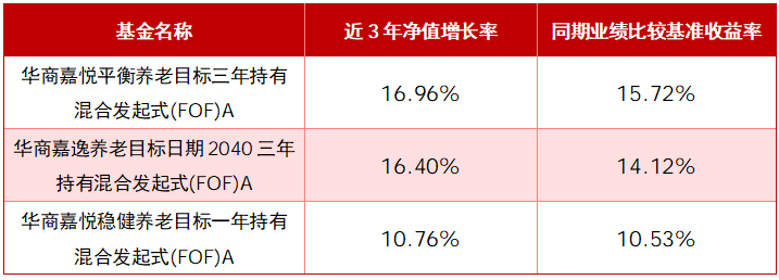 以上产品的净值增长率、同期业绩比较基准表现数据均来自基金定期报告。华商嘉逸养老目标日期2045五年持有期混合发起式(FOF)成立未满3年,故不展示业绩。华商嘉悦平衡养老目标三年持有混合发起式(FOF)Y近3年基金净值增长率为18.25%;华商嘉逸养老目标日期2040三年持有混合发起式(FOF) Y近3年基金净值增长率为18.26%;华商嘉悦稳健养老目标一年持有期混合发起式(FOF)Y近3年基金净值增长率为12.02%;以下为孙志远管理的全部基金业绩及业绩比较基准收益率,数据均来源于基金定期报告,最新基金份额净值详见华商基金官网。