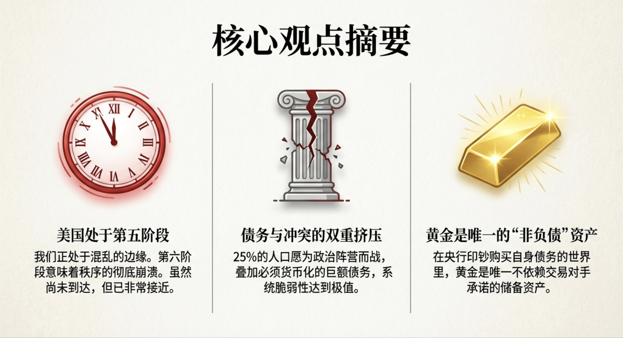 并直言在当前的债务与政治动荡下,黄金是唯一“非他人负债”的资产。同时对普通人提出尝试储蓄、配置黄金、择地而居等生存策略。