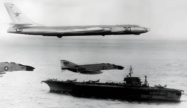 第一次飞跃堪称完美,图-16R以60米高度掠海突进,巧妙利用地球曲率避开雷达;精准锁定目标后,从航母舰岛上方30米处呼啸而过。甲板美军清晰看见飞行员手势,惊惶中撞翻设备。