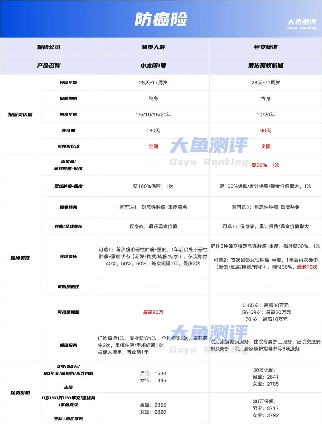 这里推荐的是少儿专属防癌险小太阳1号,和可投保年龄跨度很大的恒安标准爱佑保领航版。两款都是互联网产品,全国可投保。
