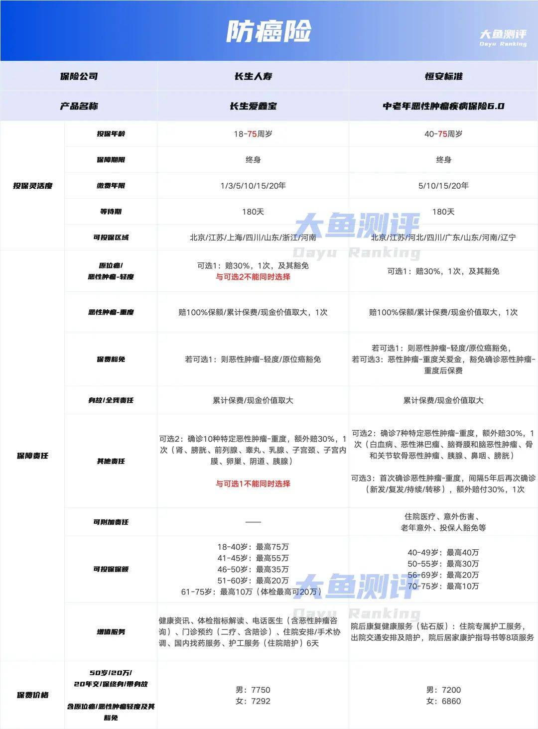 两款产品都属于是责任覆盖比较全面,同时有不少可选责任和特色责任,比如它们都有确诊特定恶性肿瘤-重度的额外赔付,两款各自设定的癌症部位各不相同,长生主要聚焦在男性女性的高发器官;恒安标准主要聚焦在血液类和脑部肿瘤等情况。