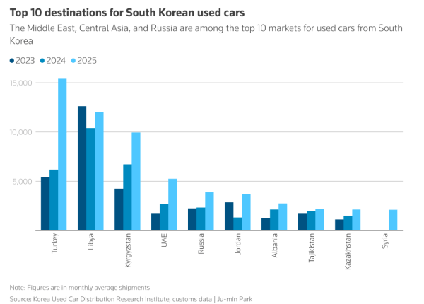 当前,二手车销量已经占韩国汽车出口总量的四分之一,出口额占13%。韩国政府数据显示,韩国出口的二手车大部分销往中东、中亚和俄罗斯。韩国二手车流通研究所所长申铉道表示,今年1—6月,韩国向中东销售的二手车数量超过了新车,而向俄罗斯销售的二手车月平均销量增长了40%。
