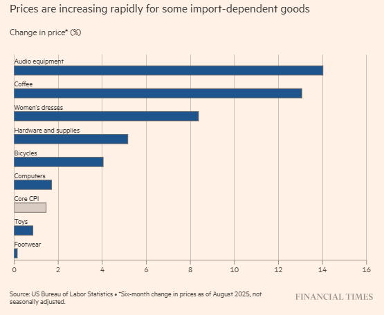 报道称,官方数据和企业声明显示,在企业清空库存并将关税成本转嫁给消费者后,一系列依赖贸易的商品价格出现加速上涨。报道援引美国劳工统计局的数据指出,在截至8月的六个月时间内,音响设备价格上涨14%,女装价格上涨8%,工具、五金用品上涨5%——这些商品大多依赖进口。
