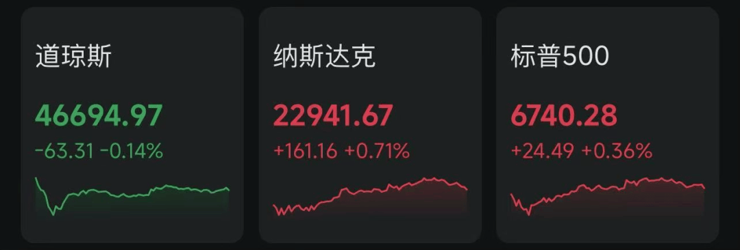 当地时间10月6日,在AI热潮带动下,美股标普500指数与纳指联袂再创新高。截至收盘,道指跌63.31点,跌幅0.14%,报46694.97点;纳指涨161.16点,涨幅0.71%,报22941.67点;标普500指数涨24.49点,涨幅0.36%,报6740.28点。