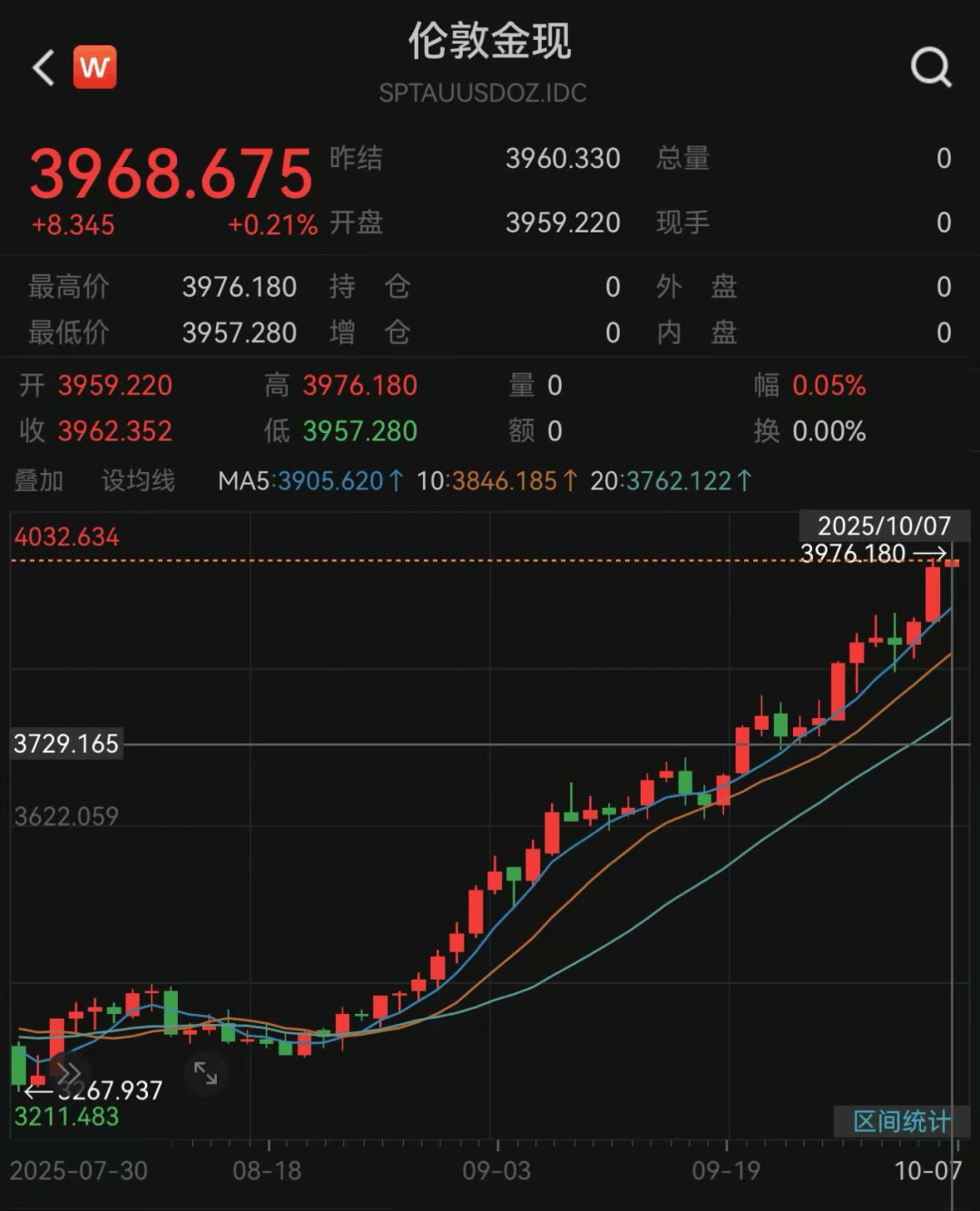 10月7日亚洲早盘,黄金市场热度不减,期现货黄金携手又创新高。其中,伦敦现货黄金盘中最高触及3976.18美元/盎司,COMEX黄金向上逼近4000美元/盎司,最高涨至3999美元/盎司。