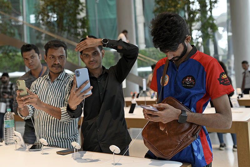 当地时间2025年9月19日,印度孟买,顾客在Apple BKC门店查看iPhone 17系列产品。当日,iPhone 17在印度上市。视觉中国
