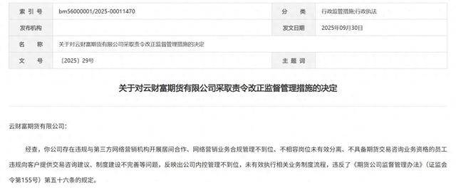 内控管理不到位,云财富期货被责令改正!4名责任人遭警示