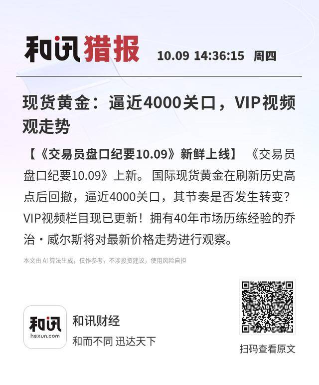 【《交易员盘口纪要10.09》新鲜上线】《交易员盘口纪要10.09》上新。 国际现货黄金在刷新历史高点后回撤,逼近4000关口,其节奏是否发生转变?VIP视频栏目现已更新!拥有40年市场历练经验的乔治·威尔斯将对最新价格走势进行观察。
