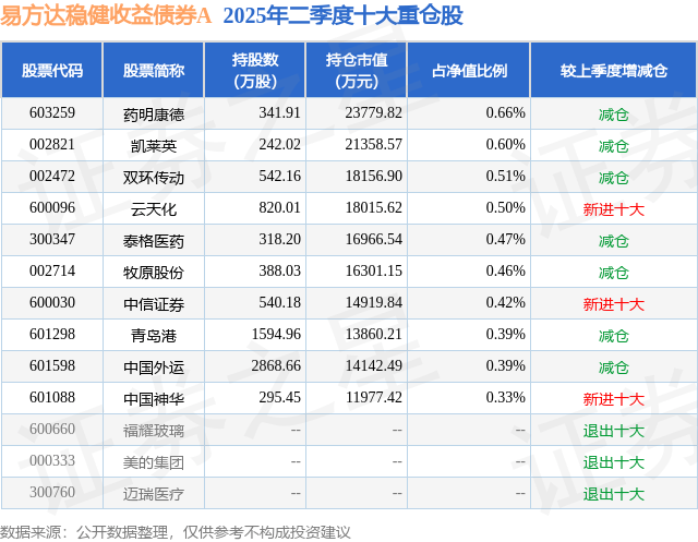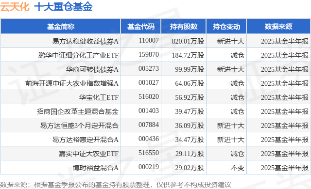 根据2025基金半年报公募基金重仓股数据,重仓该股的公募基金共31家,其中持有数量最多的公募基金为易方达基金的易方达稳健收益债券A。易方达稳健收益债券A目前规模为101.04亿元,最新净值1.4293(9月30日),较上一交易日上涨0.22%,近一年上涨6.4%。该公募基金现任基金经理为胡剑。胡剑在任的基金产品包括:易方达裕惠定开混合A,管理时间为2013年12月17日至今,期间收益率为187.26%;易方达岁丰添利债券(LOF)A,管理时间为2019年1月4日至今,期间收益率为55.02%;易方达恒盛3个月定开混合,管理时间为2019年9月6日至今,期间收益率为45.65%。