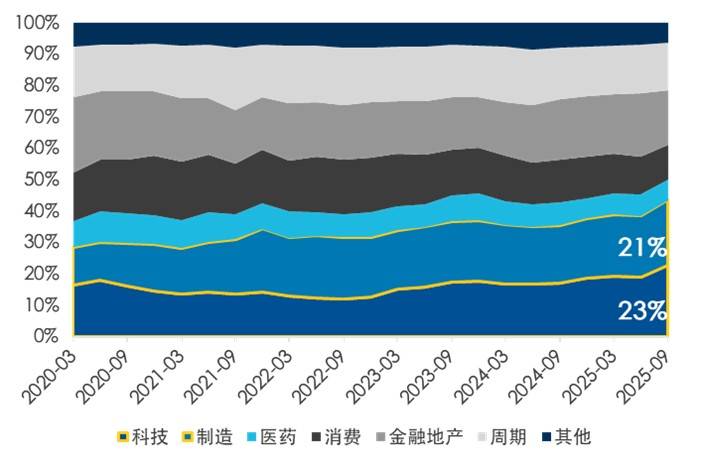 另一方面,中国在半导体、机器人、军工、创新药等多个领域有实质性突破,科技+制造的市场关注度持续提升,市值占比亦持续增长。