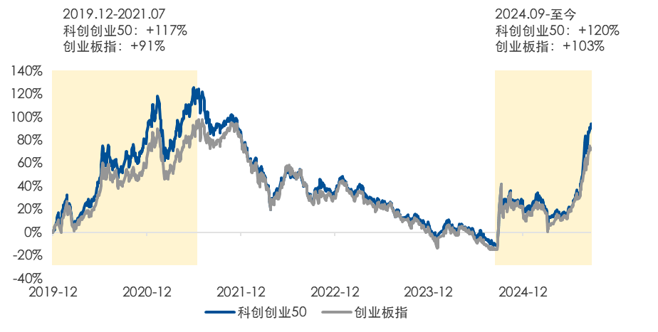 进一步落实到指数角度,两个囊括了各成长行业龙头公司的重点指数——科创创业50指数以及创业板指备受关注,这两个指数从去年9月以来均已上涨超100%。