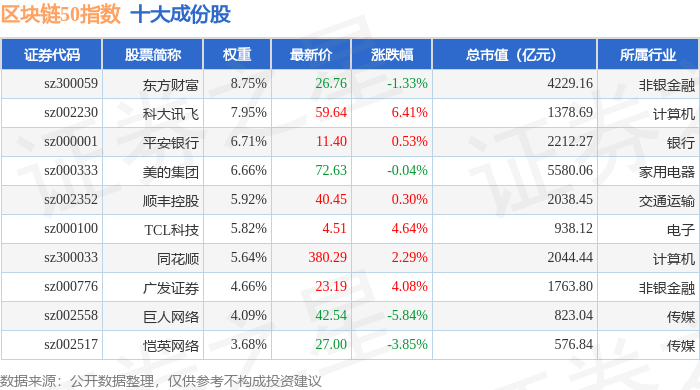 证券之星消息,10月9日,区块链50(399286)指数报收于4295.42点,涨1.23%,成交872.91亿元,换手率4.07%。当日该指数成份股中,上涨的有39家,视觉中国以10.02%的涨幅领涨,下跌的有9家,金固股份以10.02%的跌幅领跌。