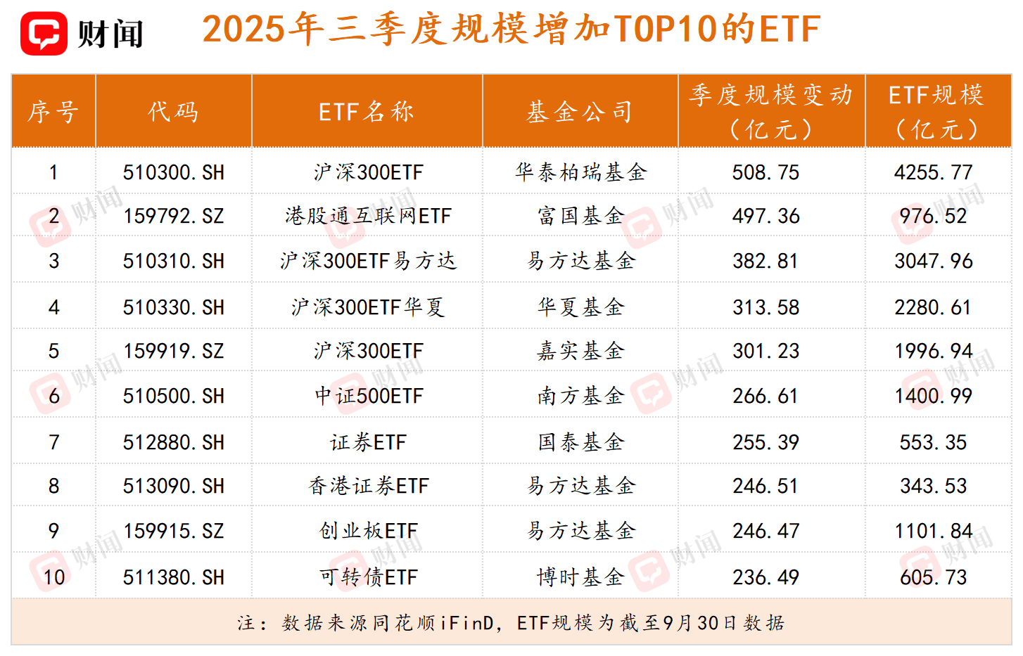 三季度规模增加前10名的ETF中,当前市场规模排名前四的4只跟踪沪深300指数的产品全部上榜,三季度规模共增加1506.37亿元,其中仅华泰柏瑞旗下的沪深300ETF一只产品,三季度规模就增长超500亿元。