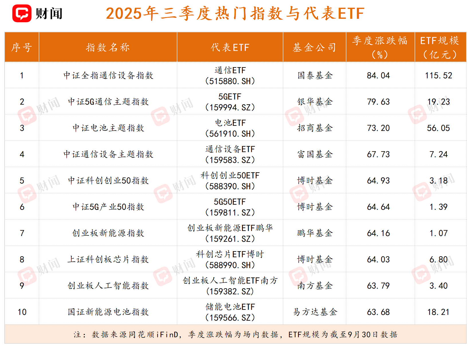 在ETF市场上,唯一一只跟踪中证全指通信设备指数的通信ETF以84.04%的涨幅,成为三季度ETF市场上的“冠军”产品,该产品的规模也从二季度末的27亿元猛增至三季度末的115.52亿元。此外,固态电池热度的持续攀升,也带动电池、新能源等相关主题的ETF产品涨幅持续走高。