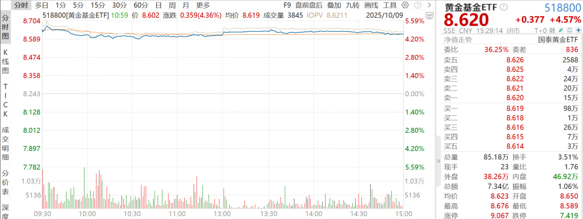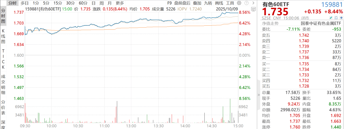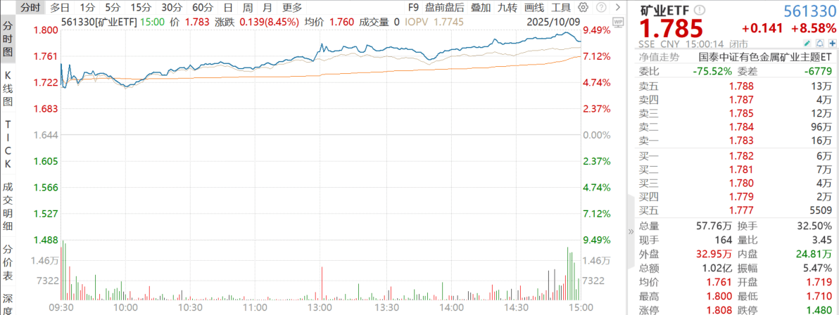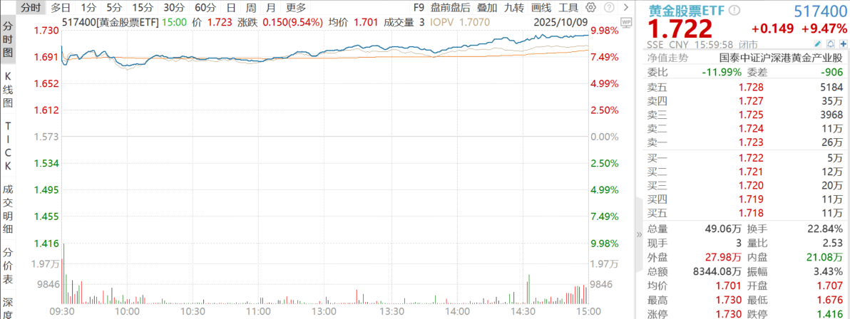 黄金股票ETF大涨9.47%、矿业ETF大涨8.58%、有色60ETF大涨8.44%、黄金基金ETF大涨4.57%点评