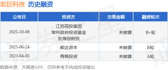 证券之星消息,根据天眼查APP于10月8日公布的信息整理,常州宏巨电子科技有限公司B+轮融资,融资额未披露,参与投资的机构包括江苏高投集团,常州政府投资基金,东海创新投。