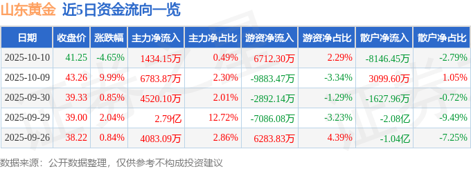证券之星消息,截至2025年10月10日收盘,山东黄金(600547)报收于41.25元,下跌4.65%,换手率1.94%,成交量70.3万手,成交额29.25亿元。