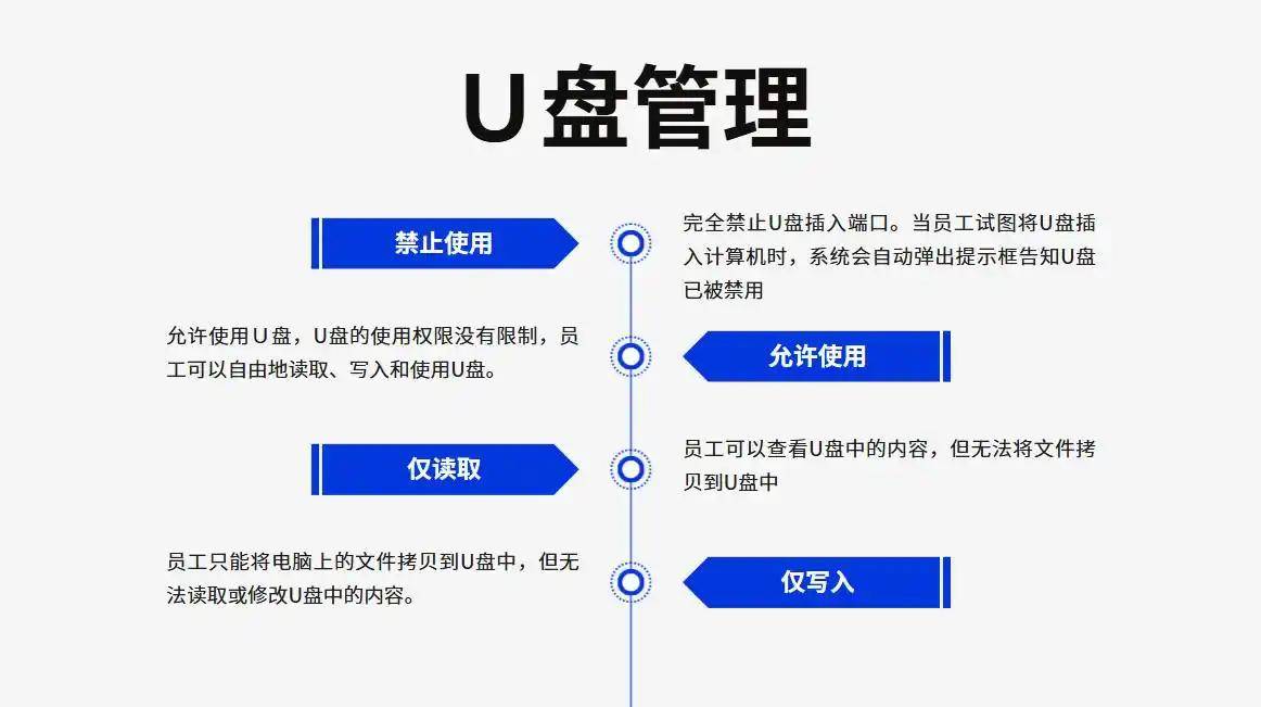 可禁止所有U盘,或只允许公司注册地U盘使用。私人U盘插上没反应,彻底断了物理拷贝的路。